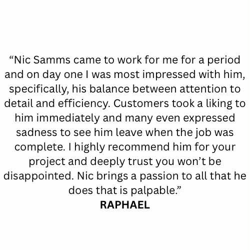 Nic Samms came to work for me for a period and on day one I was most impressed with him, specifically, his balance between attention to detail and efficiency. Customers took a liking to him immediately and many even expressed sadness to see him leave when the job was complete. I highly recommend him for your project and deeply trust you won’t be disappointed. Nic brings a passion to all that he does that is palpable.
