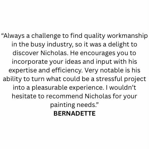 Always a challenge to find quality workmanship in the busy industry, so it was a delight to discover Nicholas. He encourages you to incorporate your ideas and input with his expertise and efficiency. Very notable is his ability to turn what could be a stressful project into a pleasurable experience. I wouldn’t hesitate to recommend Nicholas for your painting needs.