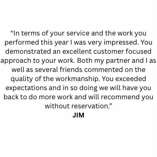 In terms of your service and the work you performed this year I was very impressed. You demonstrated an excellent customer focused approach to your work. Both my partner and I as well as several friends commented on the quality of the workmanship. You exceeded expectations and in so doing we will have you back to do more work and will recommend you without reservation.